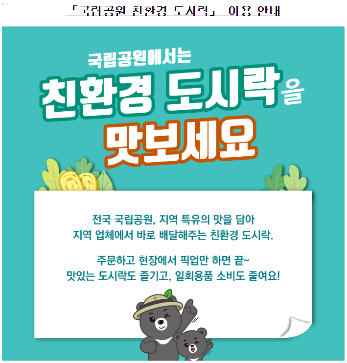 전국 국립공원에서 지역 특유의 맛을 담아 지역 업체에서 직접 배달해 주는 친환경 도시락을 운영하고 있습니다. 주문방법으로는 카카오톡 채널 또는 지역업체 직접 전화주문으로 간편하게 할 수 있고 일회용품 소비도 줄일 수 있으면 현장에서 직접 받아 받을 수 있는 도시락입니다.