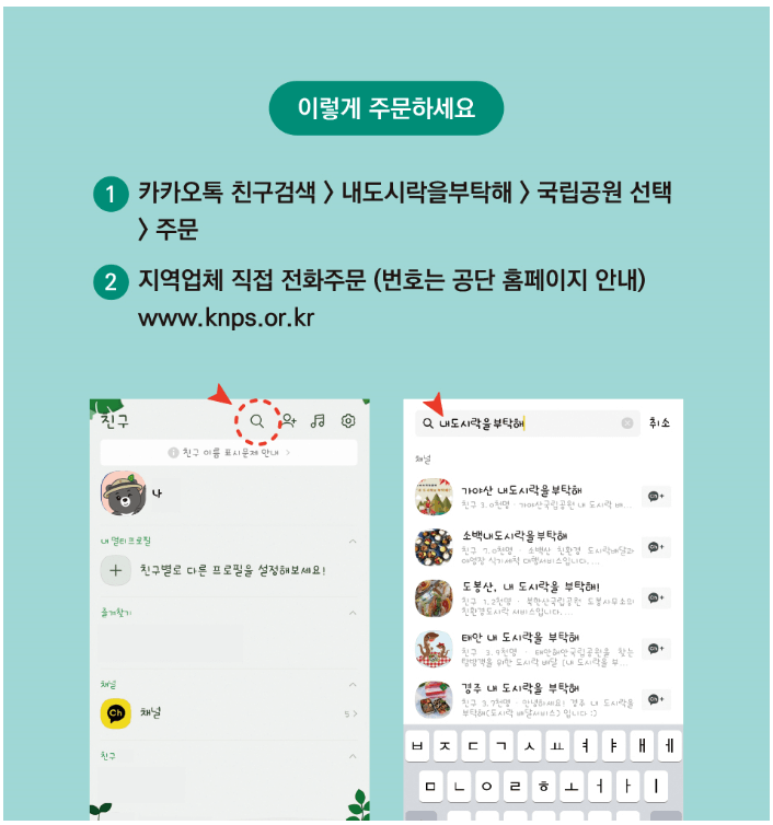 1. 카카오톡 채널을 통한 주문은 카카오톡에서 ‘OO산 내 도시락을 부탁해’ 검색 후 친구 추가 → 채널 홈 확인 후 안내에 따라 주문